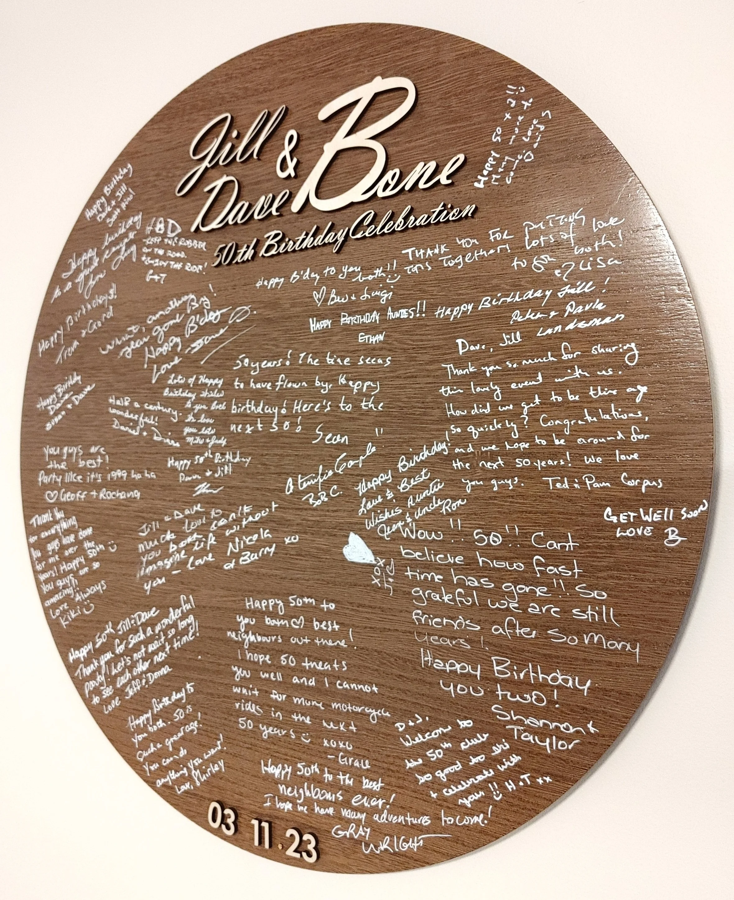 Our 18in diameter Signature Boards are hand crafted to your individual specifications. We offer flexibility and guidance with personalizing and customizing your Signature Board.